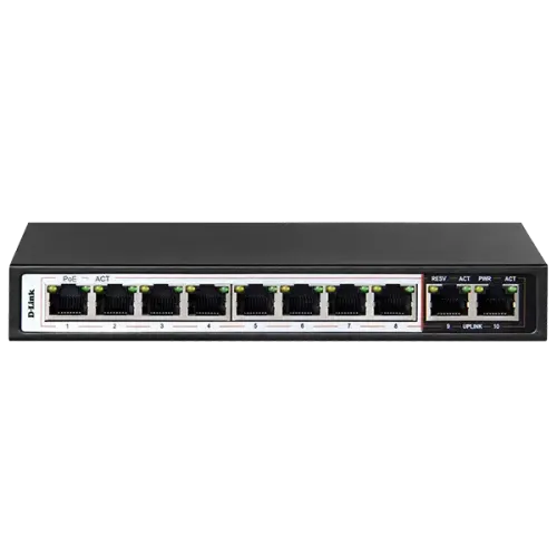 Model: DES-F1010P-E PoE Ports: 8x 10/100 Mbps Fast Ethernet PoE+ Ports Uplink Port: 2x 10/100 Mbps Uplink Ports PoE Budget: 96...